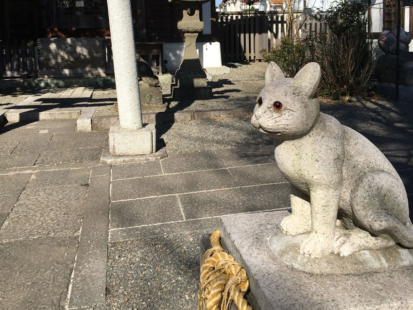 Antiguamente la gente de este barrio se dedicaba a la cría de gusanos de seda a finales del Edo. Como los gatos cazan ratones, en este santuario adoraba a gatos como ángel de guarda para sericultores. En caso de que los gatos no volvieran a casa, la gente venía al santuario para pedir su vuelta a casa.