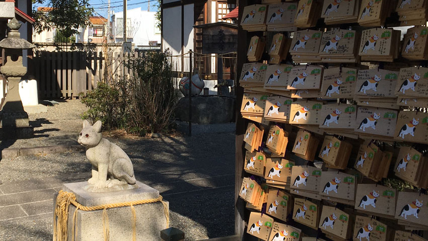 La Ema 絵馬 es una tableta votiva con imagen de caballo, ya que originalmente donaron caballo vivo a santuario sintoísta. Sin embargo la imagen de Ema de este santuario, por su puesto, es de gata tricolor. Las Emas donadas en santuario están llena de amores de sus propietarios.