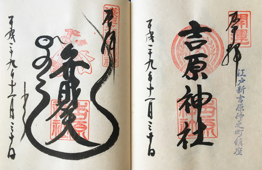 El Yoshiwara jinja ofrece dos tipos de Goshuin; unos del santuario y otro de la diosa Benzaiten. El Goshuin de Yoshiwara Benzaiten queda muy bonito representado una serpiente, ya que la diosa suele estar acompañada por una serpiente.