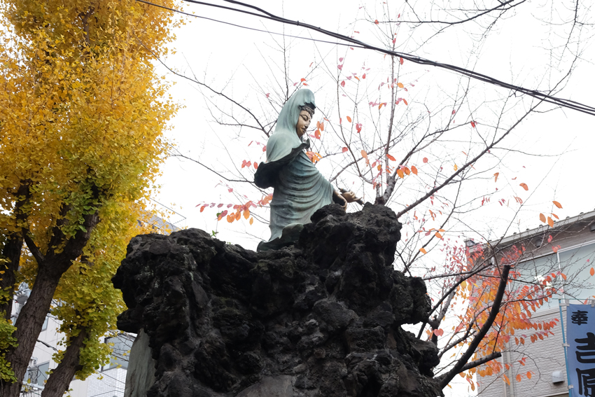En su recinto hay una estatua de Kannon encima de una pequeña roca, con la placa conmemorativa para las víctimas del terremoto de Kanto. Según la historia, aquí fue triste escena en la que 490 cortesanas se ahogaron en un pequeño lago que existía aquella época mientras intentaban escapar del incendio. Incluso hoy en día, muchas personas visitan el santuario para ofrecer oraciones y hacen ofrendas.